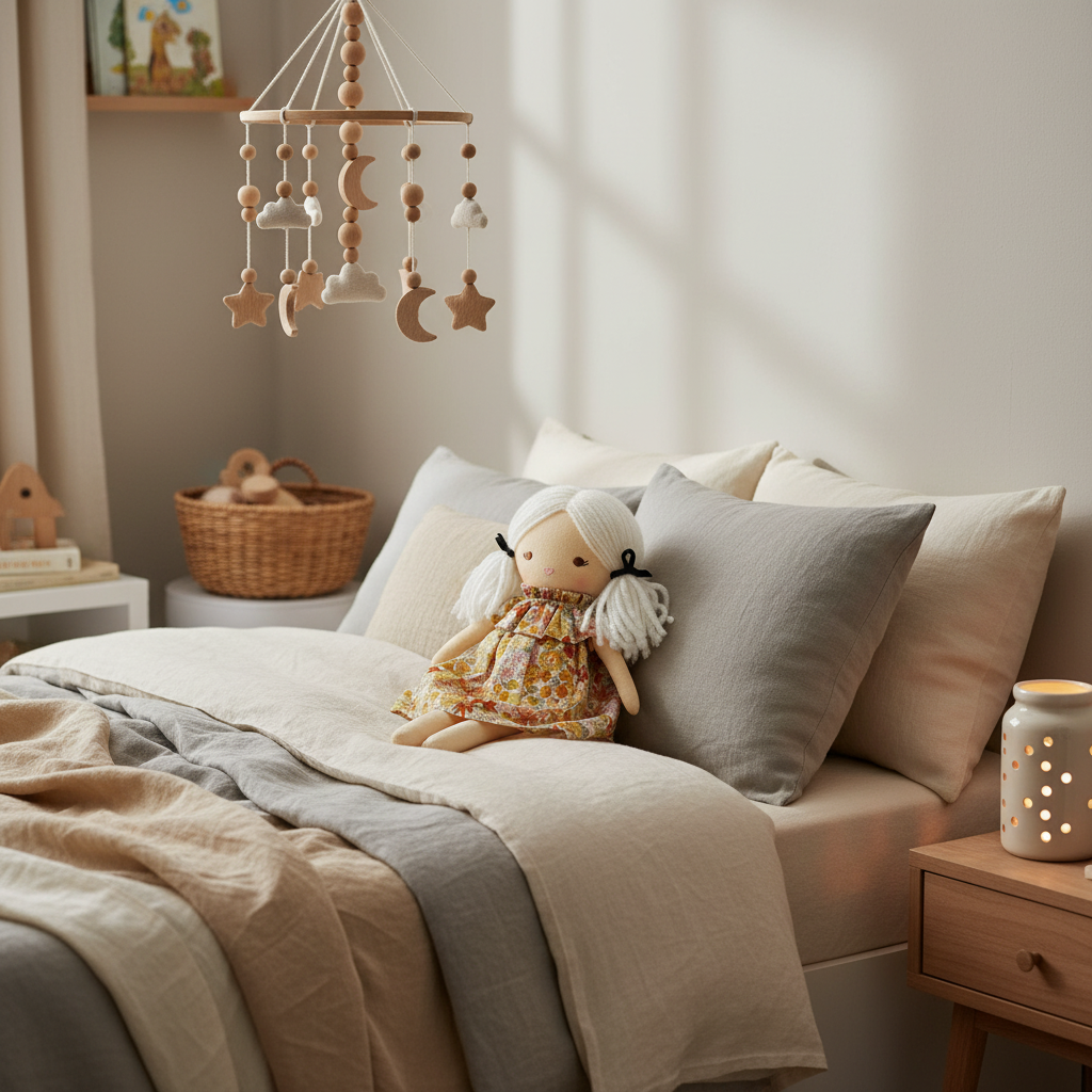 The ALIMROSE Mini Matilda doll, measuring 24cm, features a charming design with sleepy eyes on one side and awake eyes on the other, adding interactive play value. Dressed in a delicate floral dress, this flat-style doll is crafted from soft cotton and poly cotton with a plush fibre-filled interior, ensuring a cuddle-friendly experience. Its embroidered face enhances its adorable appearance. Designed for children aged 3 and up, it pairs perfectly with the separately sold mini sleeping bag for cozy naps and imaginative play.