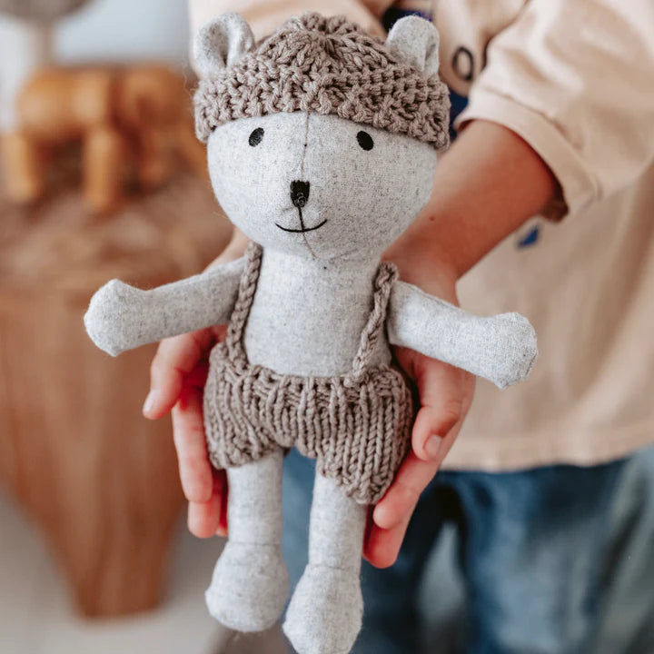 Discover our new range of cotton plush soft toys, crafted from a carefully selected natural cotton fabric known for its exceptional softness. Each item in our collection features knitwear made from premium Australian merino wool, underscoring our dedication to supporting local farmers and ensuring top-quality products. Meet George Bear, a charming member of our minis collection. This delightful bear is made from a soft wool blend and dressed in overalls and a hat knitted from Australian merino wool. Perfect from birth, George measures 25cm and is proudly designed and made in Australia.