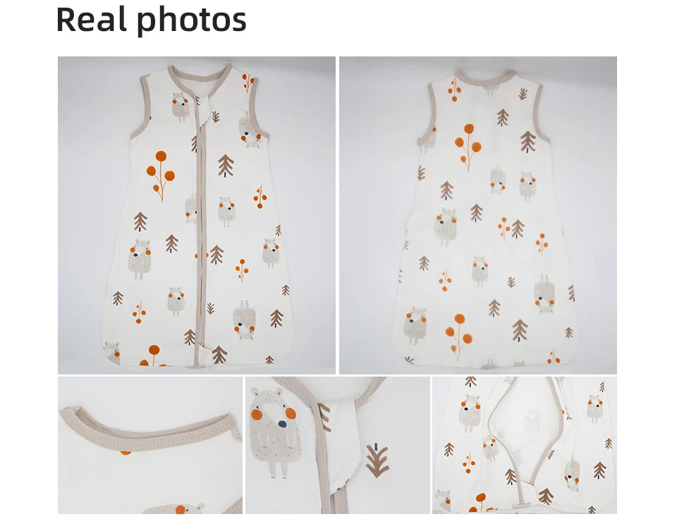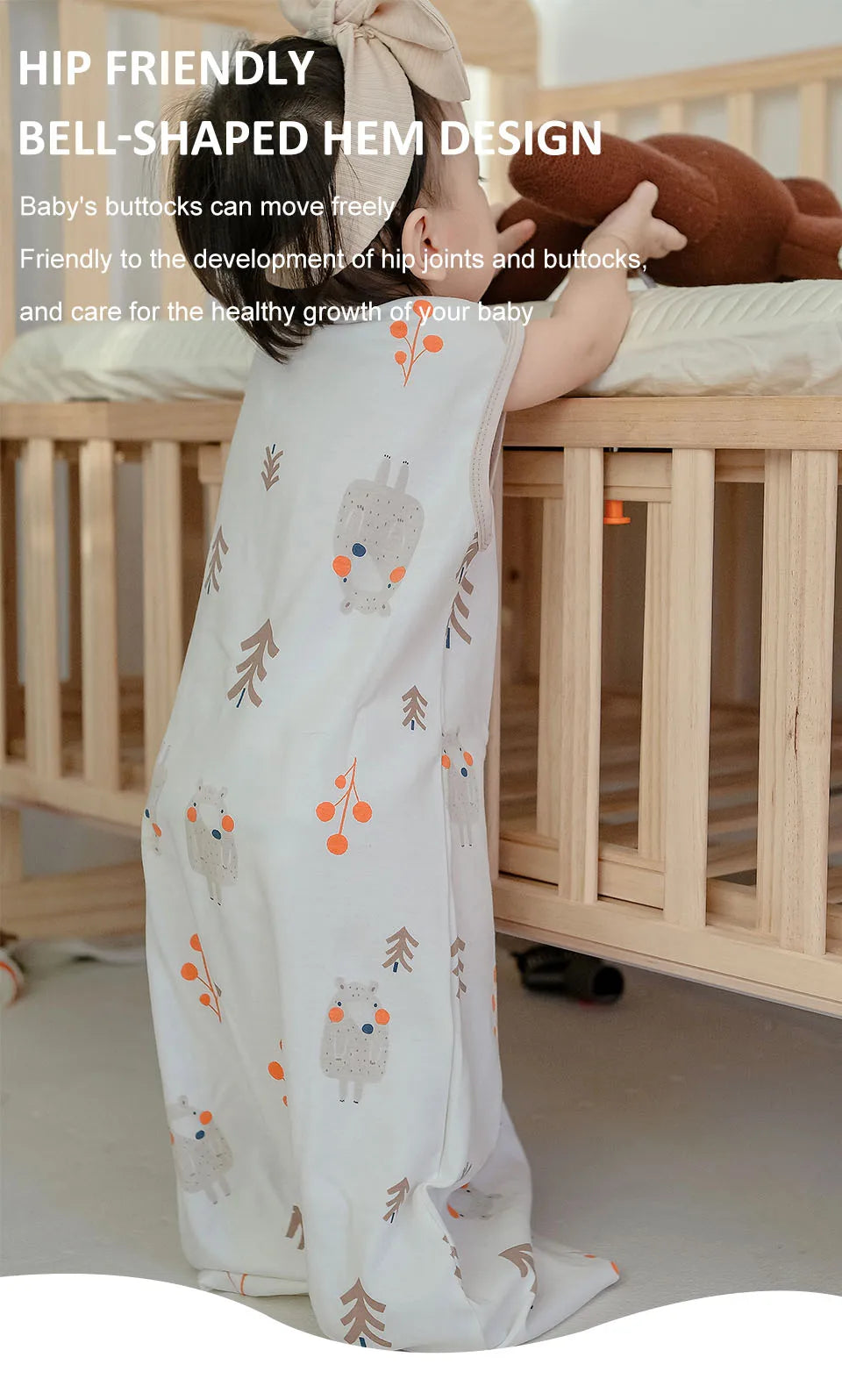 This summer baby sleeping bag is crafted from 100% breathable cotton, ideal for keeping your little one comfortable in warmer months. Its design allows free movement of the baby's hips and buttocks, supporting healthy joint development. The loose hem provides ample space for leg movement while gently wrapping your baby for a secure, cozy feel. Equipped with zipper protection for added safety, this sleepsack is an expert choice for promoting restful, secure sleep while accommodating natural movement.