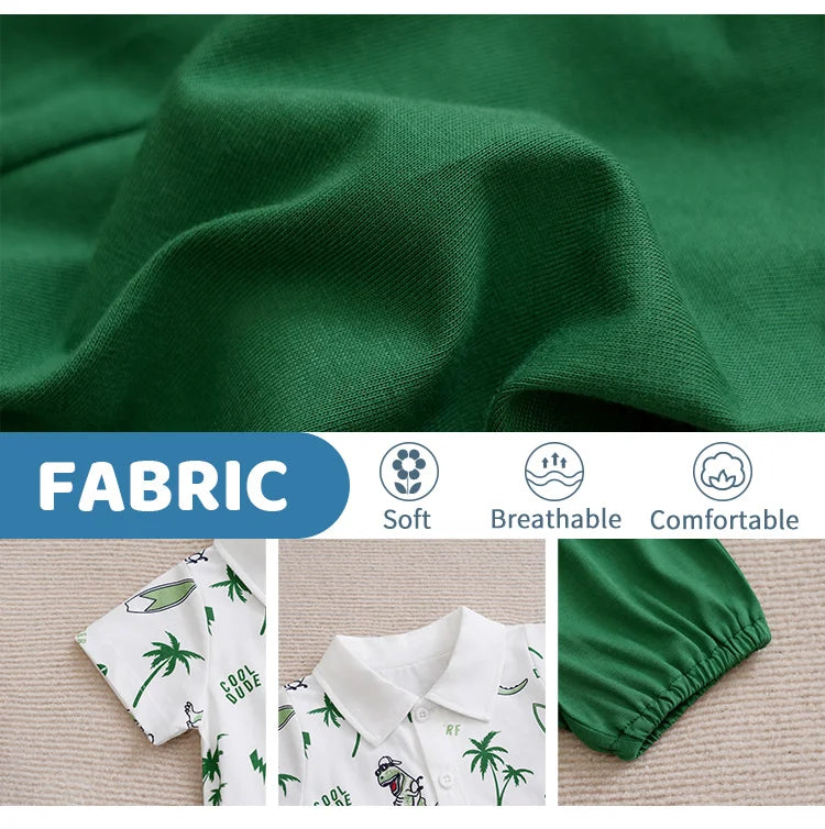 Introduce your little one to comfort and style with this charming dinosaur-print outfit set. Crafted entirely from soft, breathable cotton, the ensemble features a short-sleeve shirt paired with coordinating pants—perfect for warm weather play. The playful dinosaur design captures toddler imagination while the quality cotton construction ensures all-day comfort for sensitive skin. Ideal for active babies and toddlers who need clothing that keeps up with their adventures. A versatile addition to any summer wardrobe.