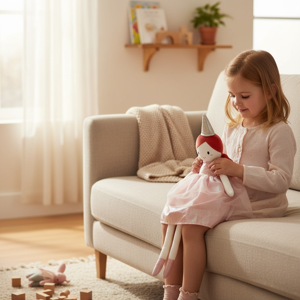 Ruby Rose features beautiful red hair, soft embroidered facial details and a delicate pink satin dress, her pointed silver hat completes her whimsical fairy tale look. Every Stitches is thoughtfully made, giving her a gentle charm that little ones adores.