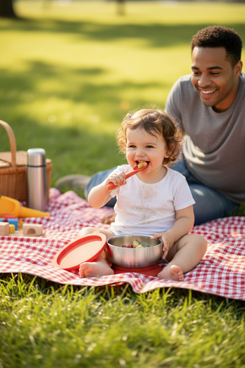 The Lion & Lady 18/8 Stainless Steel Feeding Bowl combines durable, food-safe materials with practical features for hassle-free mealtimes. Its 18/8 stainless steel body offers long-lasting use, while the silicone suction base secures the bowl to any surface to prevent spills. The airtight silicone lid preserves freshness and warmth, with double stainless walls providing extended temperature retention. Included is a toxin-free, food-grade silicone spoon designed for safety and ease of use. As your child grows, the removable silicone seal adapts to their needs, making this bowl a reliable companion from babyhood well into primary school.