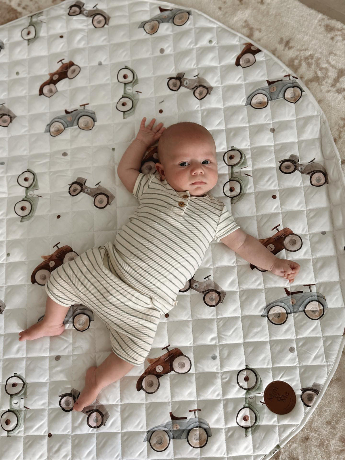 Use the Mini & Me Padded Waterproof Playmat Cars for tummy time, park playdates, and everyday fun. This 120cm playmat offers a soft, breathable surface made from 100% organic cotton, with a waterproof TPU layer to protect underlying surfaces from spills and accidents. Its reversible design features a playful car print on one side and a solid waterproof colour on the other. Suitable from newborns to older children, it includes a multi-use storage bag for convenience. Easy to care for with cold hand wash only, this playmat combines comfort, practicality, and durability for active little ones.