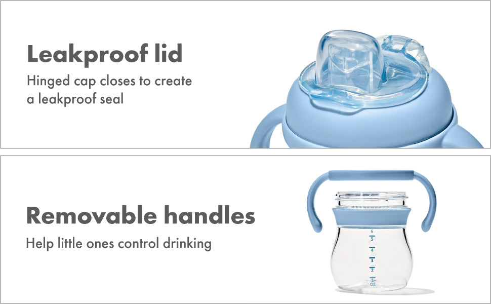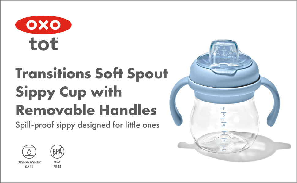 Smarter (and tougher) than the average sippy cup, the 6 oz. OXO Tot Transitions Soft Spout Sippy Cup has a silicone spout that conforms to baby’s mouth for a comfortable sip and less mess. Plus, the hinged cap closes to create a leakproof seal and protect the spout when not in use. The removable handles provide a comfortable grip for your little one, and the cap and spout are removable for easy, thorough cleaning. Dishwasher safe.