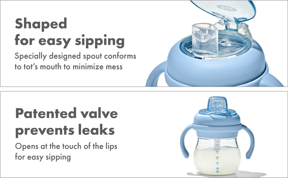 - Silicone spout is spill-proof and conforms to baby’s mouth