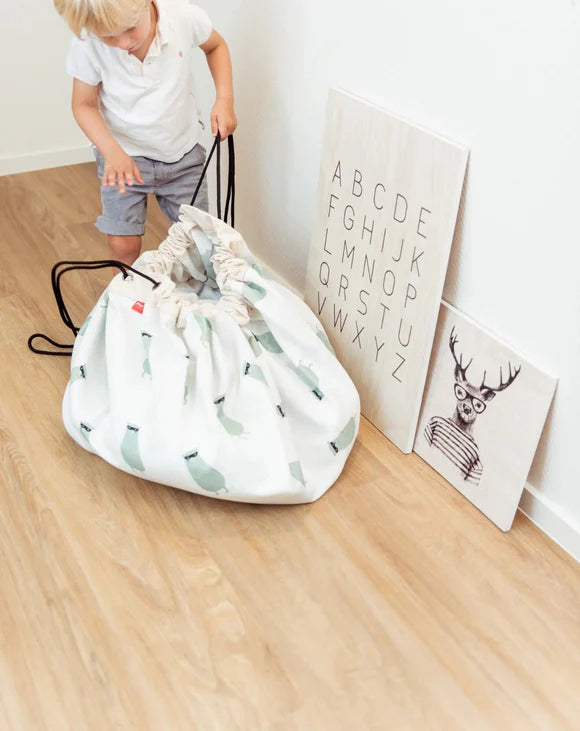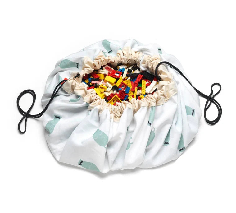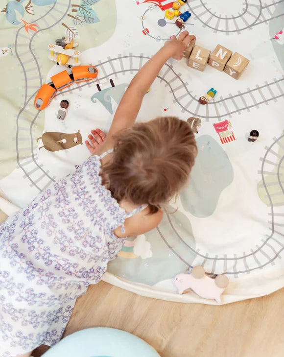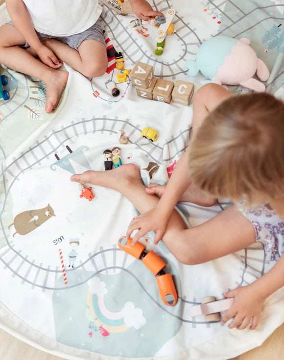 The Play & Go Toy Storage Bag - Train offers dual functionality as both a spacious storage solution and an engaging play mat featuring a train track design. This versatile 140cm diameter bag accommodates numerous toys while transforming into an interactive play surface. Crafted from a durable 70/30 cotton-polyester blend, its reversible design showcases charming bear motifs that enhance room aesthetics when closed. Perfect for efficient organization that complements contemporary children's spaces.