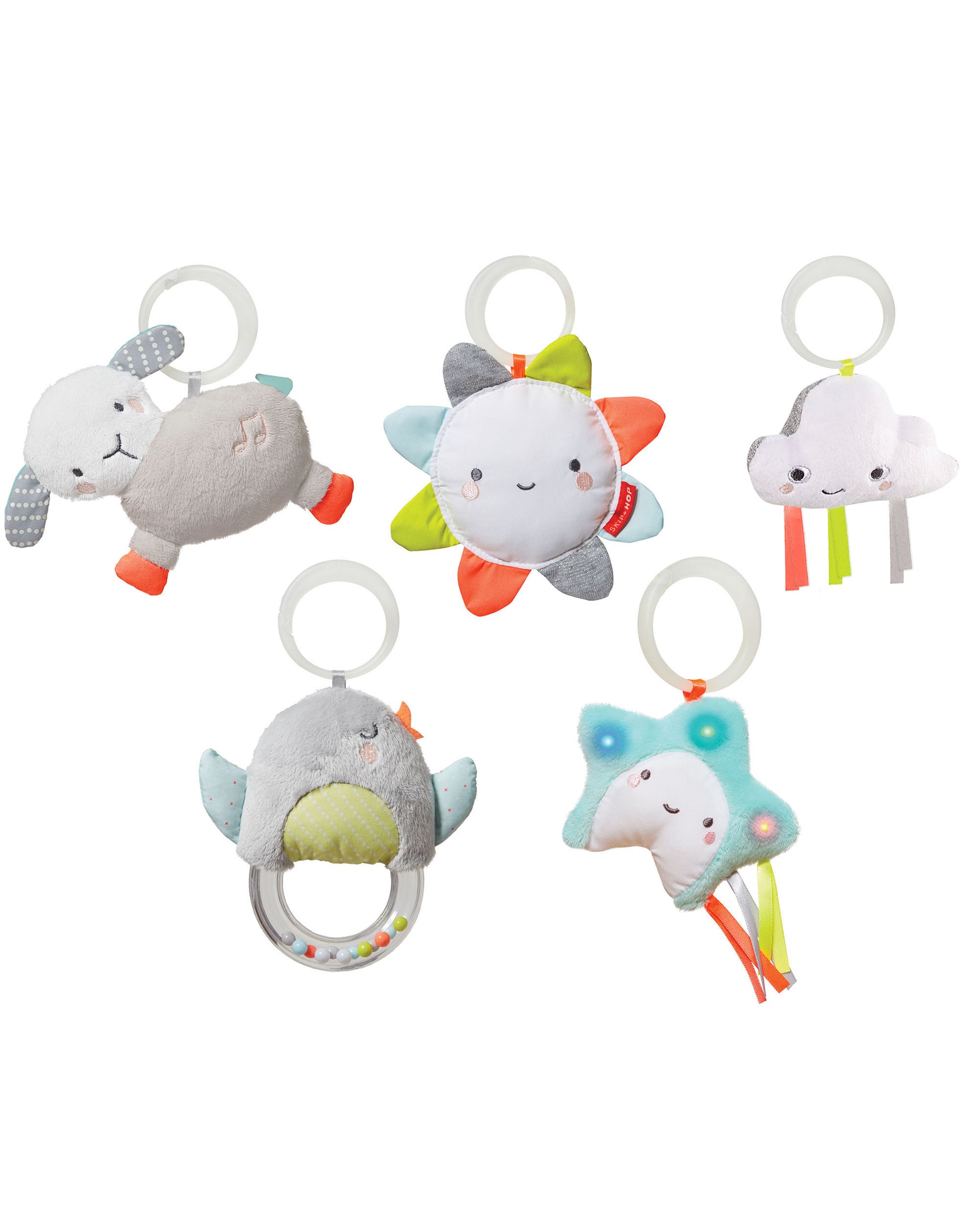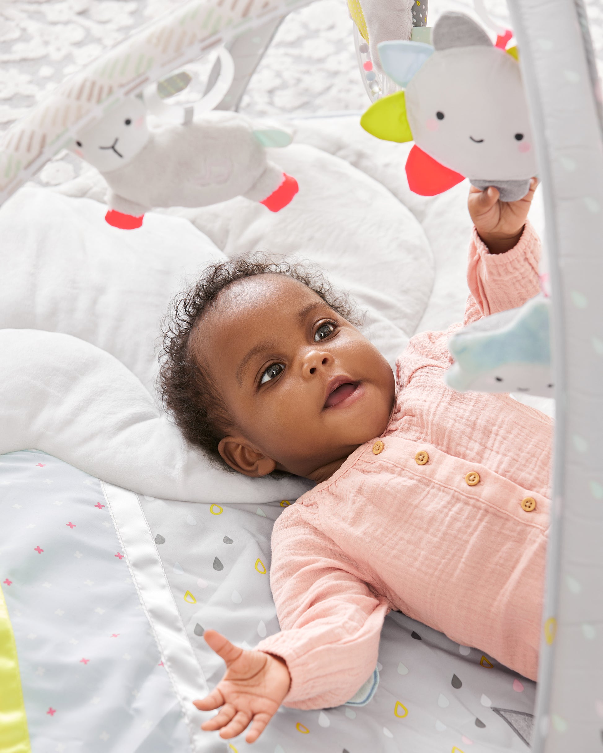 - Developmental activities include: musical sheep, light-up star, cloud squeaker, bird rattle and baby-safe sunshine mirror