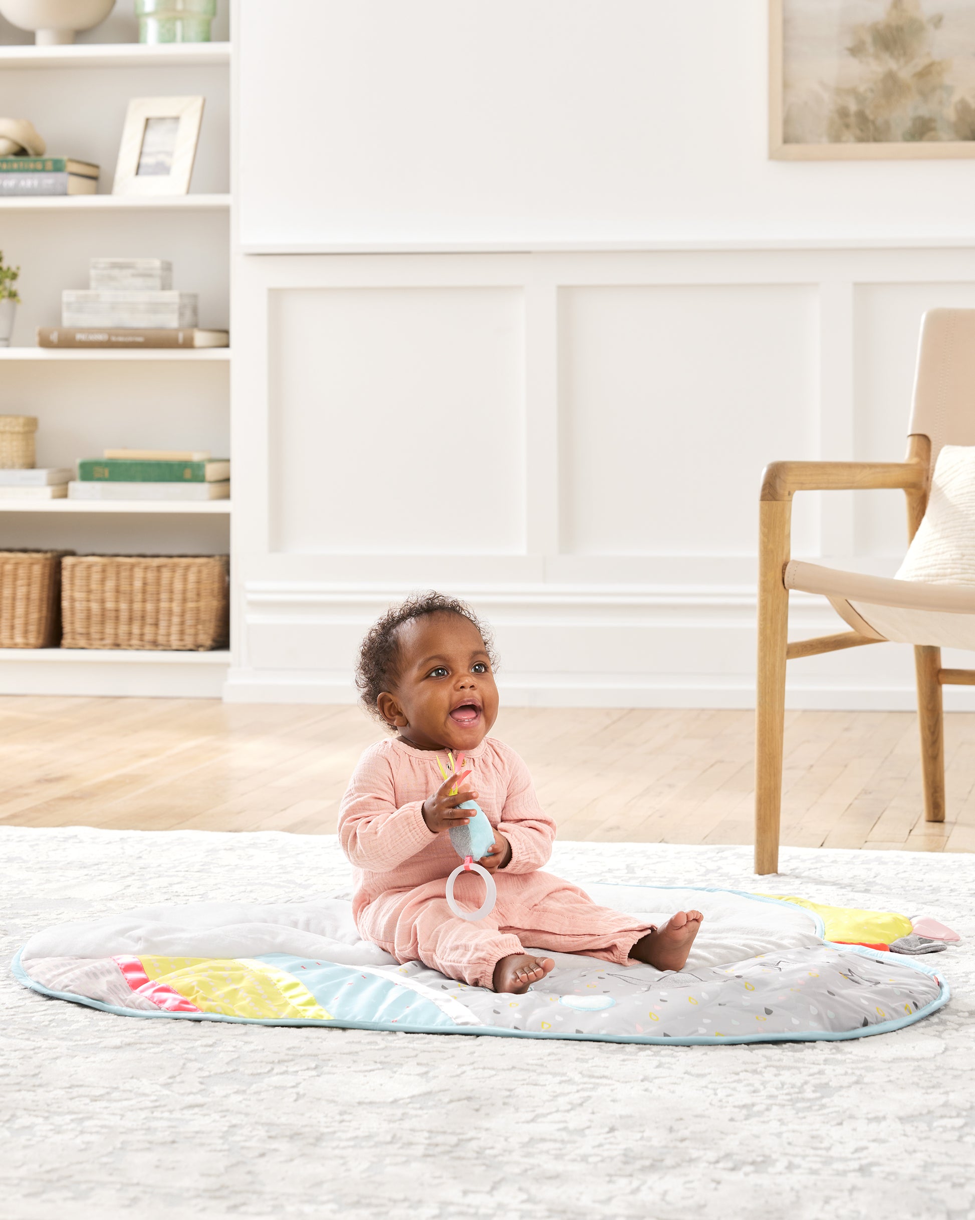 The Skip Hop Silver Lining Cloud Activity Gym combines soothing design with stimulating play. Its soft, modern color scheme is accented with neon highlights to encourage visual development. Five celestial-themed toys offer lights, music, and tactile engagement, while the plush mat provides comfortable support for your baby. This gym creates an inviting environment that promotes sensory exploration and cozy relaxation, making it an ideal choice for early developmental play