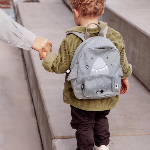 The Trixie Backpack - Mr. Shark is designed for young adventurers, combining practicality with comfort. Crafted from 100% cotton with a water-repellent finish, it features adjustable padded shoulder straps and a chest strap to ensure a secure fit. A spacious main compartment and a front pocket with easy-to-use zippers provide ample storage for school essentials and snacks. The top handle allows for convenient carrying or hanging, while an internal name tag helps keep track of belongings. Measuring 31 x 23 cm, this backpack is an ideal companion for your child’s first school days or outings.